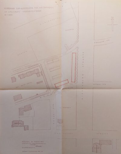 Bauplan für zwei neue Baracken auf dem Gelände des Lagers an der Hindenburgstraße vom 6. November 1942. Zu diesem Zeitpunkt dienten die Baracken des Lagers als Notunterkünfte für ausgebombte Familien. Bei den beiden rot umrandeten Baracken handelt es sich um die geplanten Unterkünfte, die von der Reichsbahnbaudirektion übernommen und neu gebaut werden sollten. Zwar wurde dies nicht realisiert, aber es ist davon auszugehen, dass später an gleicher Stelle andere, kleinere Baracken errichtet wurden. Der Plan belegt außerdem, dass zu diesem Zeitpunkt bereits vier andere Baracken im Bau waren. Darüber hinaus macht der Plan deutlich, dass der südliche Platz (der heutige Kunstrasenplatz) als Sportplatz der Hitlerjugend genutzt wurde.