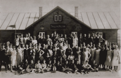 Gruppe der Sozialistischen Arbeiterjugend vor ihrem Jugendheim auf dem Gelände des heutigen Kunstrasenplatzes. Das Gelände wurde, wie auch das Jugendheim, nach der nationalsozialistischen Machtübernahme 1933 gewaltsam beschlagnahmt und anschließend von der Hitlerjugend genutzt.
