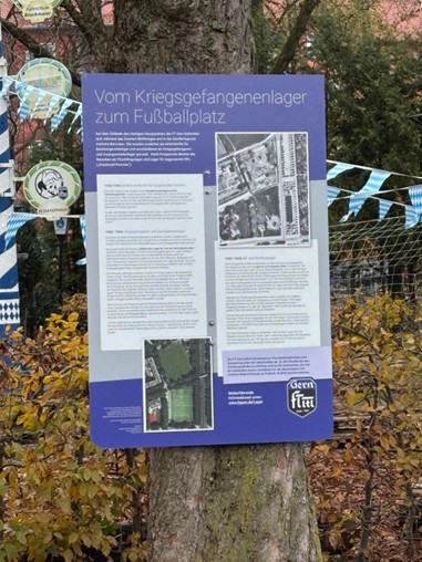 Wer den Hauptplatz der FT Gern betritt, dem fällt neuerdings schnell auf, dass sich etwas verändert hat: An einem der Bäume unseres Biergartens hängt, für jede und jeden gut sichtbar, eine große Tafel. Sie soll an die Geschichte unseres Hauptplatzes erinnern, die deutlich bewegter war, als man es von einem durchschnittlichen Fußballplatz wohl vermutet.